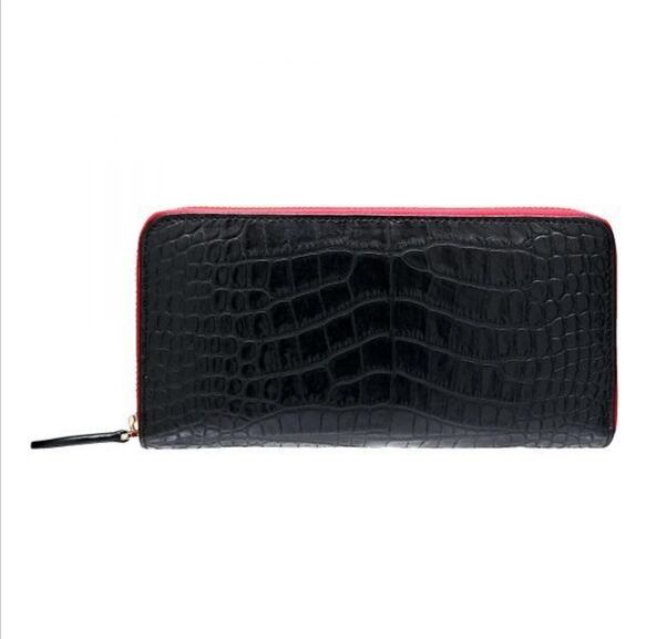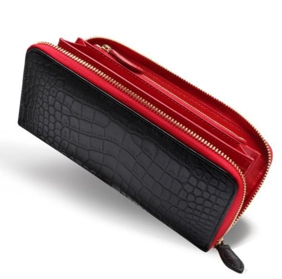 本革クロコダイル型押しラウンド長財布|黒×赤の艶が映える、21枚収納のフルスペックモデル